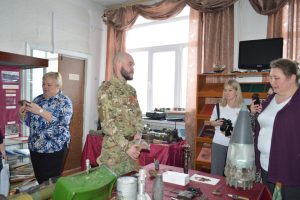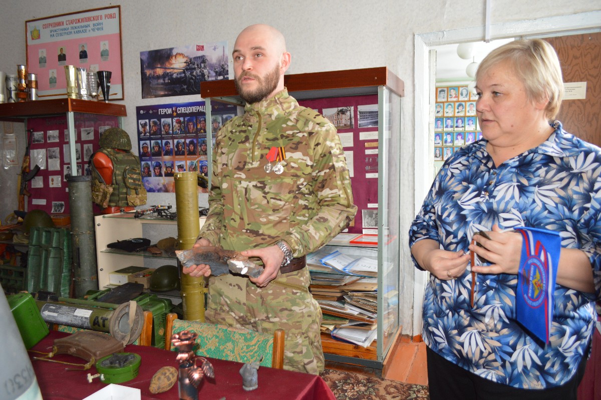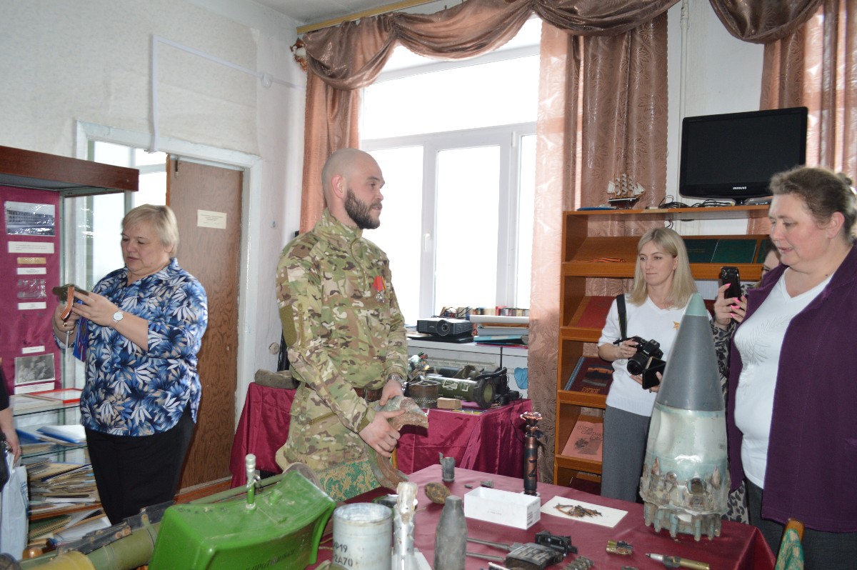 Затем гости посетили школьный музей Боевой славы, экспозиции которого за последние годы пополнились экспонатами с передовой СВО. Василий Прошкин передал привезенные им трофеи с фронта руководителю музея Ирине Курьяновой.