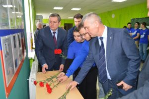 В подразделении колледжа имени Н.Н. Комарова Сергей Иванович вместе с главой и первым замом пообщался с молодыми избирателями и возложил цветы к стенду выпускников, которые погибли в локальных войнах и на СВО. По словам Александра Соушева, сейчас администрация работает над увековечиванием памяти бойцов, заказывают мемориальные доски погибшим выпускникам школ.