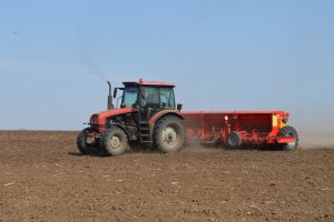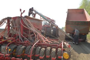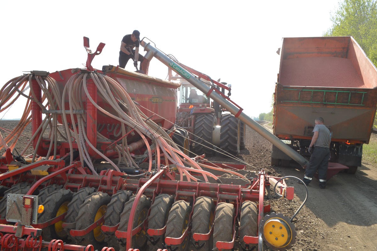 Второй посевной агрегат, под управлением механизатора Сергея Акулина, задействовали на поле у деревни Табатеровка. Посевной агрегат – 6-метровая сеялка – находился под загрузкой семенным материалом. Владимир Климушин пояснил, что это поле, после кукурузы, засевают ячменем с подсевом клевера. Под такой прием в севообороте в хозяйстве отвели 384 га, чтобы в будущем году после уборки клевера на сенаж, их запахать и посеять там озимую пшеницу.