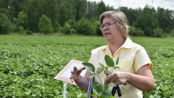 Пояснения у двух участков сои Дальневосточной селекции сорта алпетра и топаз дала заведующая кафедры селекции, семеноводства и агрохимии Рязанского агротехнологического университета, кандидат сельскохозяйственных наук Ольга Лукьянова. Ольга Викторовна поделилась своими наработками за два года выращивания данных сортов.