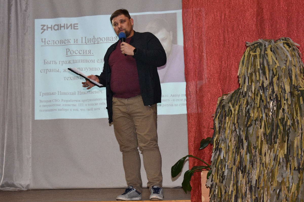 31 октября в Вороновском СДК участник программы первого потока «Герои 62», боец СВО Николай Гринько встретился с учениками из Старожиловской и Хрущёвской школ, Вороновского филиала, студентами колледжа имени Н.Н. Комарова, жителями микрорайона «Сельхозтехника» и Старожилова. «Человек и цифровая Россия: Быть гражданином единой страны, жить разумно в мире технологий» – такой была тема встречи.