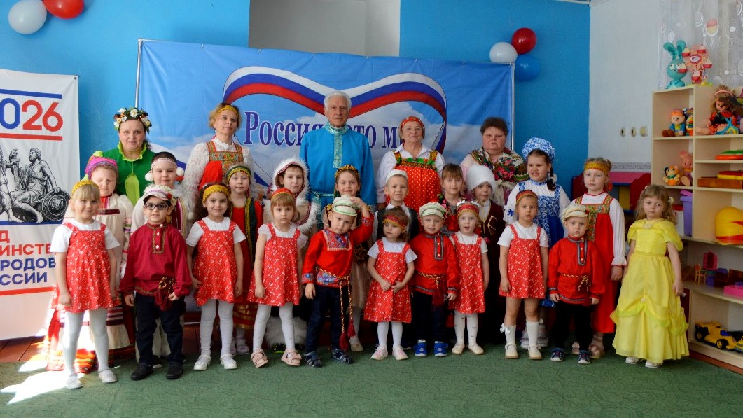 Дети весело пели и с задором танцевали. Даже двухлетние Степан Чигринов и Анна Левочкина из младшей группы участвовали во всех играх. Частушками порадовали юные таланты: Яна Кучаева, Макар Гоганян, Елена Чигринова, Тимофей Нецкин и Злата Самсонова из подготовительной группы. На празднике детям вручили сладкие подарки. Почетный гость встречи ветеран Михаил Слугин рассказал детям о единстве в большой многонациональной России – стране, в которой они живут.